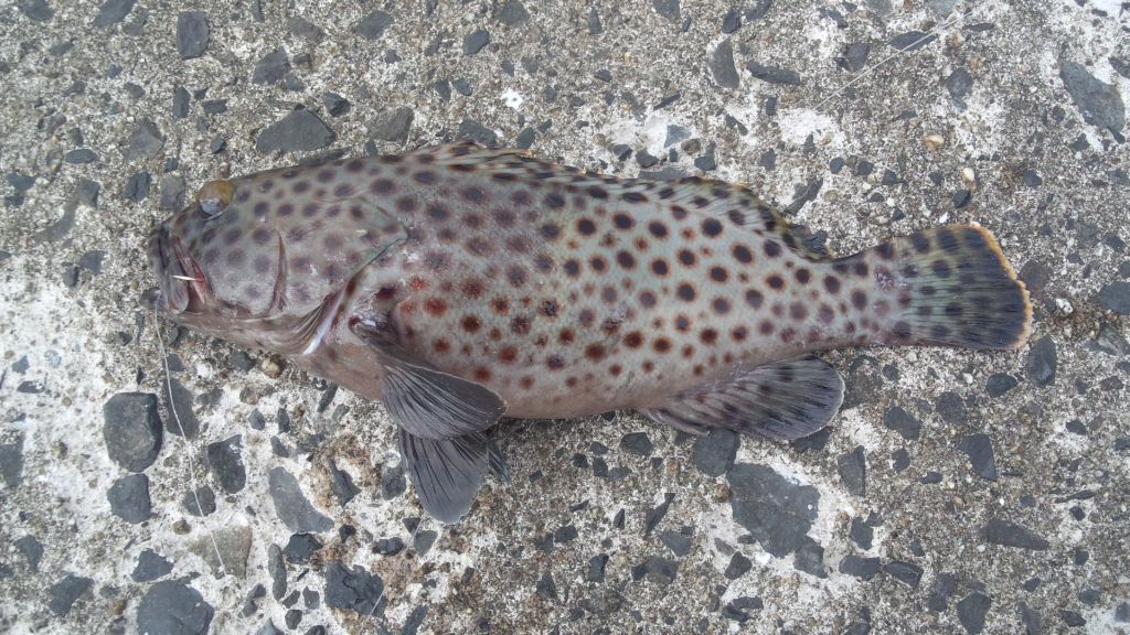 水面でラインの垂らしを加減し、竿を振って、反動で堤防の上に抜き上げる・・・よっしゃ、確保!えーとコイツは・・・シロブチハタにしては模様がまばらだな、オオモンハタとは尻尾の形が違う、カンモンハタでもイシガキハタでもない・・・まあいいや、ハタなら基本旨いさね!