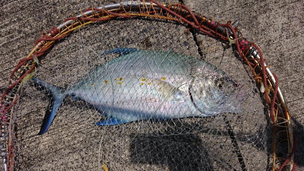 んーヒラマサではないな、ナンヨウカイワリっぽいなーと思いつつ、最近バラシが多過ぎだったので少し慎重に相手をして浮かせてみると、やはりナンヨウカイワリ。更に弱らせて落としダモを下ろし、無事一発でネットイン、よっしゃ獲ったでヒャッハー!