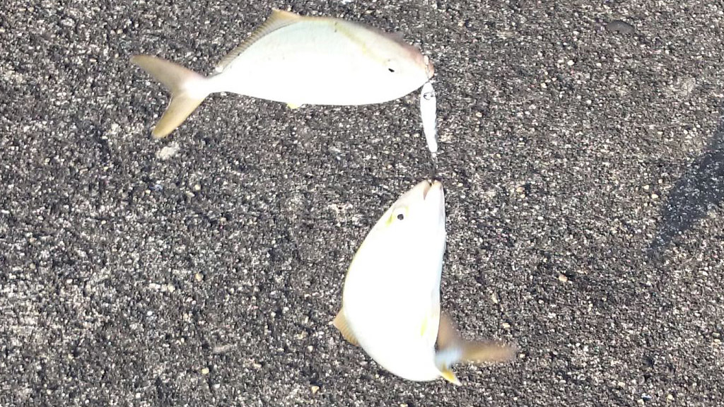 ・1つのルアーで同時に2匹魚を釣ったw栗生海水浴場界隈に、少し前から小さいカンパチの群れがいて、ルアーを投げるとたまに釣れてくる。