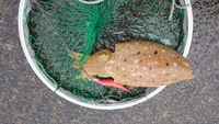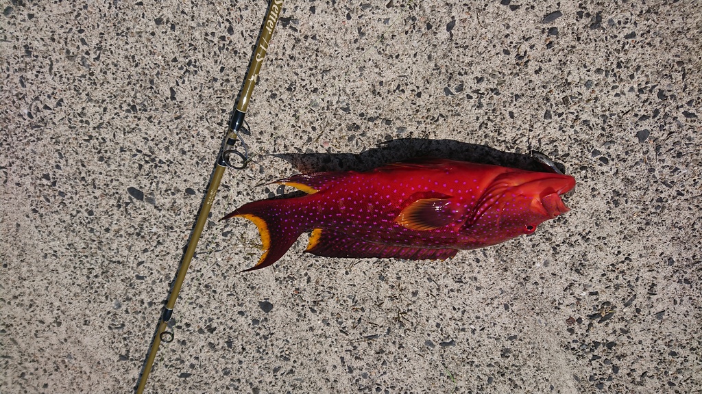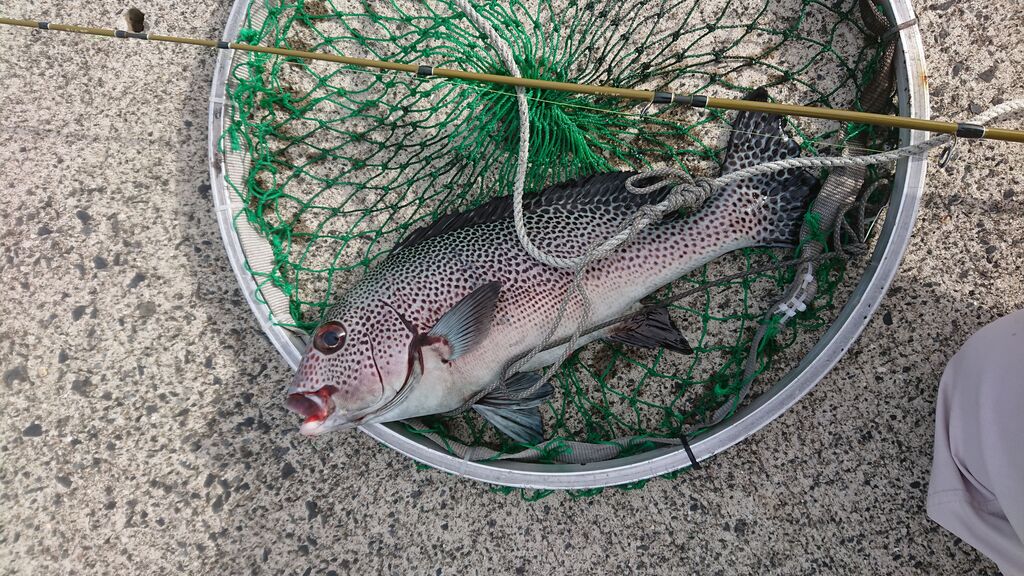 コブシメが見当たらない時、やるせなさにまかせてジグを投げたら40センチくらいのバラハタが釣れた。