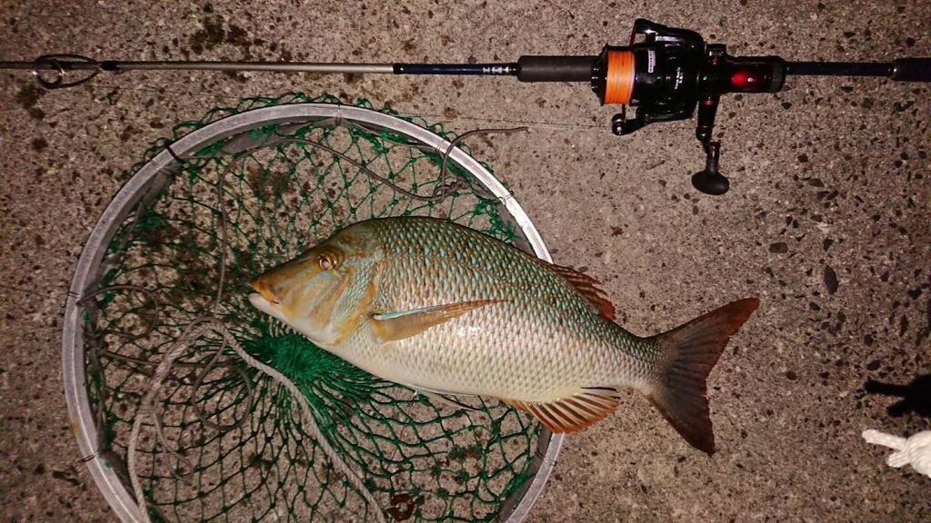重いちゃあそこそこ重いけど、大して引かないなーと思ったら、60あるなしのタマン(ハマフエフキ)だったー。(棒)タマンって引きが強いだなんだ言われてるけど、向こうを向かせない限りは案外ヘタレなんだよね、実は。