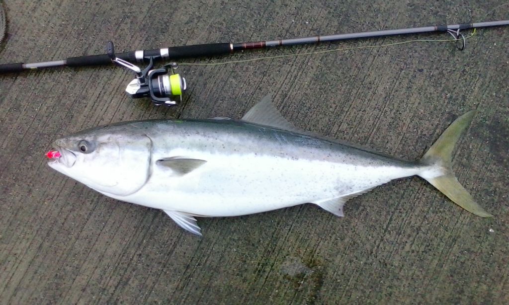 竿を立て続けているので、やがて暴れながらも足元近くに寄って来た、カンパチというかブリっぽい体型だが、重さ的には想定を遥かに超えている・・・が、頭を下に向けさせないようにしているため、魚は走るに走れずに水面でバチャバチャ暴れるしかできず、あっけないといえば案外あっけないファイトである。