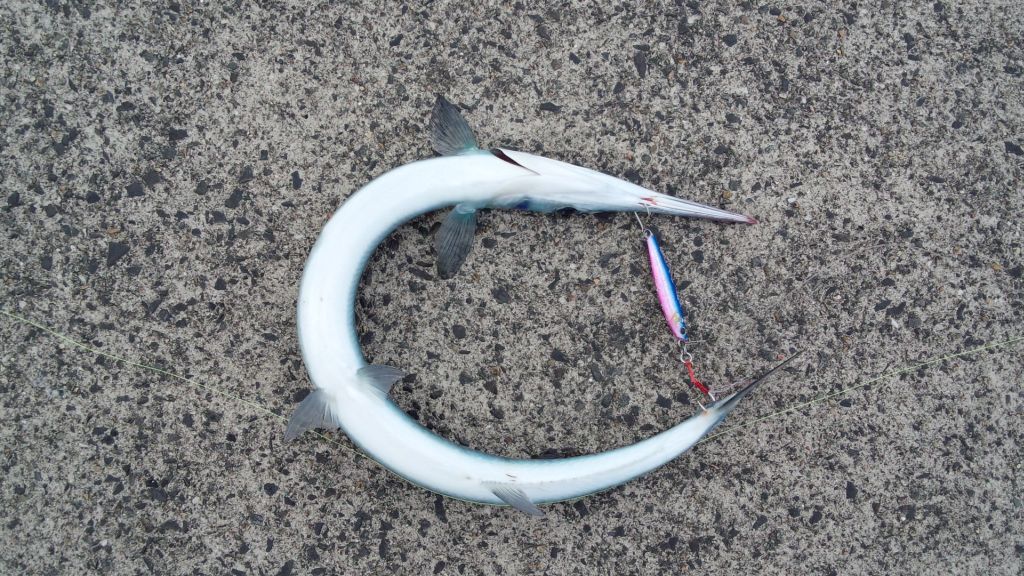 魚の正体はダツだったわけだが、まずジグのテールフックが口が掛かり、暴れている途中で尻尾にアシストフックがスレ掛かりして体がドーナツ状に固定されてしまい、暴れるにも暴れられなくなったらしいww