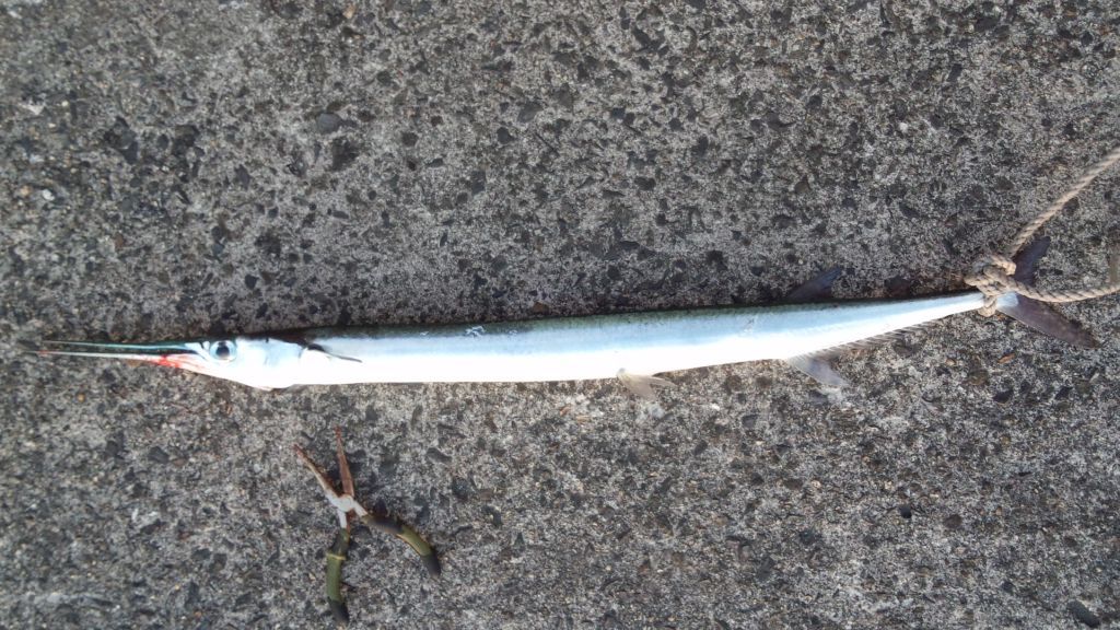 ダツ その後、遠投した先、結構深めで何かがヒット、うーん、そんなに大きくはないけど結構横に走ってるし水面近くになっても跳ねない、もしかしたらヒラマサかなー、とか思って寄せてみるとダツじゃん!