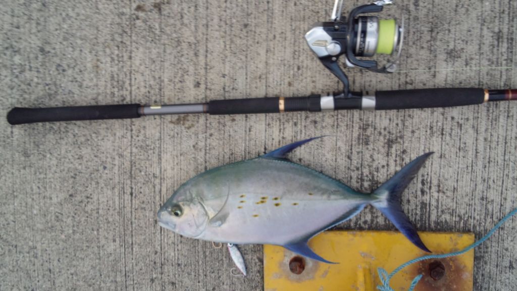 一気に抜き上げられる高さまで巻き上げると、やはりナンヨウカイワリだ、針掛かりは大丈夫そうなので、そのまま竿を振り上げて堤防の上にランディング。強引w