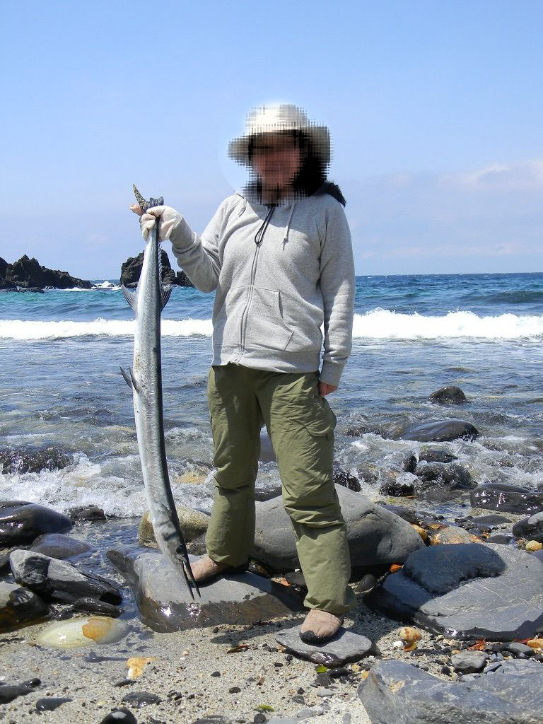 なお写真は、満面の笑みでダツをぶら下げるヨメである。