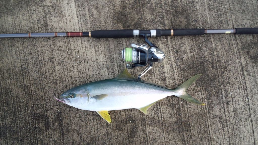 さらに少し弱らせて海面に顔を出させると、やはりヒラマサ君、50センチ位か。観念して大人しくなり、どうやらハリスも大丈夫そうなので、ドラグを締め込み、竿を真下に向けてロケット天秤の手前まで巻き上げ、少し反動をつけて一気に引き抜き、無事堤防の上にランディング。
