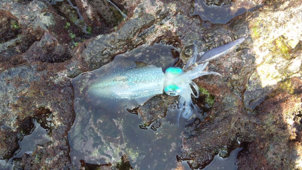 いやしかし追って来たものはしょうがない、手早くエギに付け替え、足元の溝でホイホイホイ・・・ちょw 抱いたwwこんなリーフでイカGET、まあでも小さい上にメスだったのでリリース、達者でな。