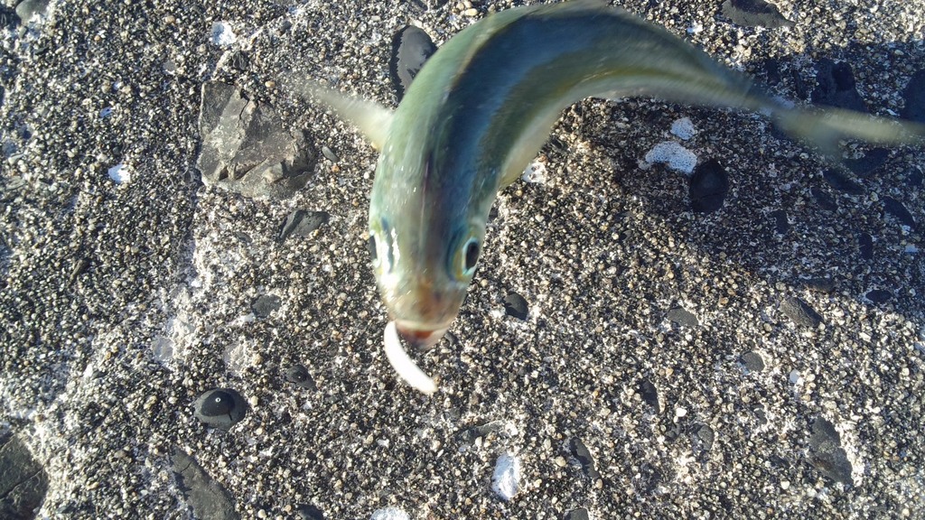 30センチちょっとのメアジ君、抜き上げられても元気に大暴れ、記念撮影はご覧の有様である・・・おい少し落ち着け、そしてそのデカい目でこっち見んなw水を汲んで血抜きをしつつ、続けて投げてみるが反応無し、まあいいやで撤収。