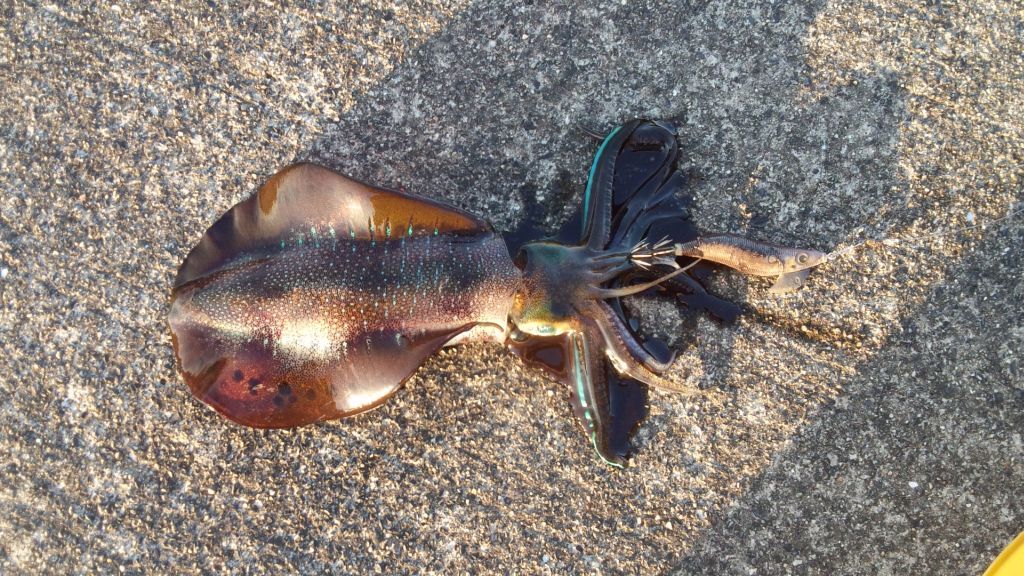 続いてエギを投入しようとすると、警戒したのかイカの姿は見えなくなっていた、しかしその辺にまだいそうではあるので、少し投げて深目に沈めてホイホイ、少し大き目にしゃくるとズシッと重さが乗った、ヒャッハー、イカポッポGET!さすがに3匹目はどっか行ったようだ。