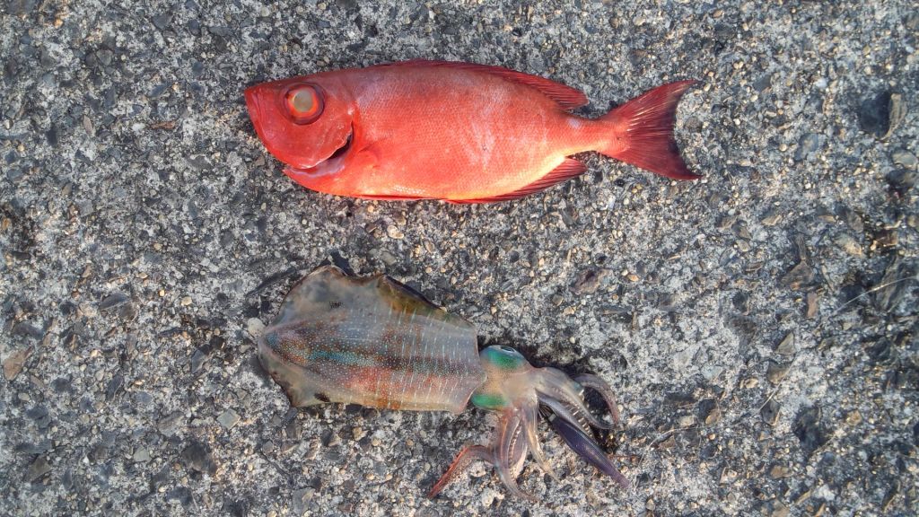 ってことで、まずはキビナゴを付けて足元に垂らしてみるとすぐにゴンゴン来た、アワセを入れるとそこそこ引く、上がってきたのは30センチちょっとのヘイケことホウセキキントキ氏。