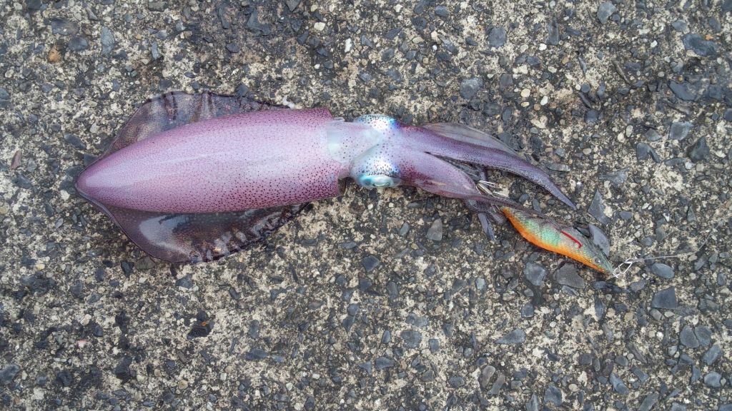 せっかく来たし10分だけ釣ってみようと、テトラ脇でエギをポイしてみると・・・あ、イカ寄って来た・・・あ、抱いたw