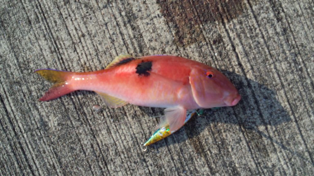 というのは、昨日のイベントの時にT氏から「昨日カンパチ4匹突いたぜ!」と聞いたからである、やはり先端方向対岸の岩場近くだったらしい。