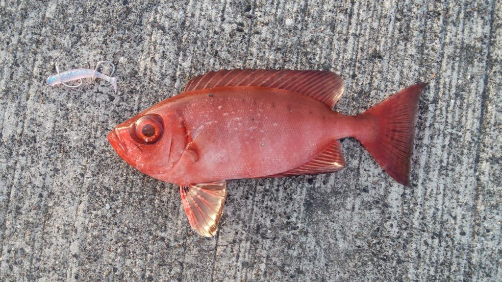 よっしゃー、まあ元気に引くがそんなに重くはないしヨスジフエダイかなー、と思って浮かせてみると、黄色ではなく赤かった、ヘイケさん(ホウセキキントキ)である。吸い物用にヘイケさんを血抜きして、もう何匹か釣ってやろうと同じ辺りを探ってみるとまた何か掛かった、がしかし激軽。これはアレか。