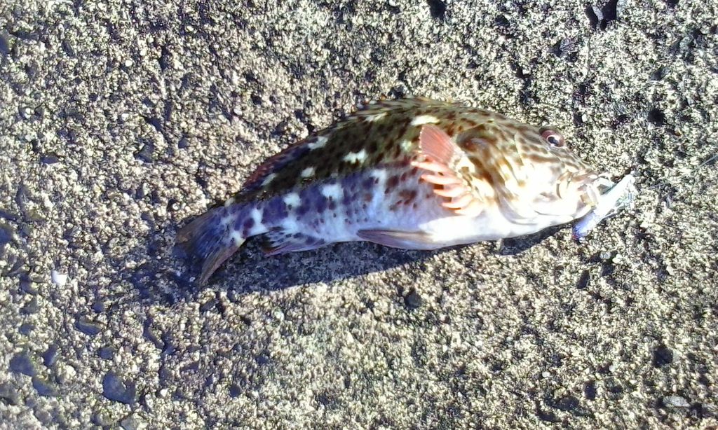 その後は何も釣れなかったので、帰りに堤防基部付近の岩場エリアで、堤防の上から小型のスピンテールジグを投げて遊ぶ。