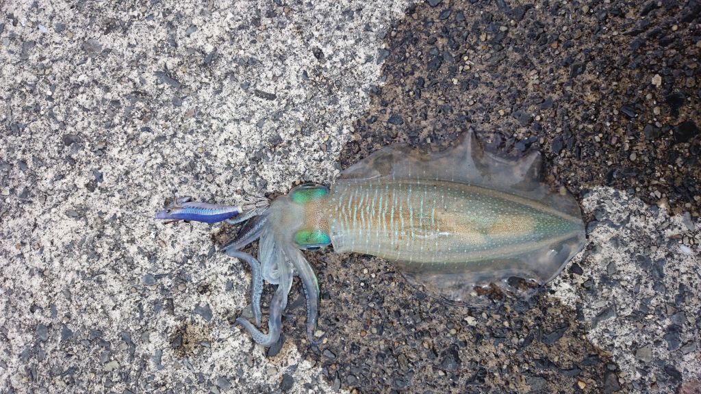 早速エギをポイしてホイホイ・・・はい抱いた!30秒ほどで速攻イカGET!