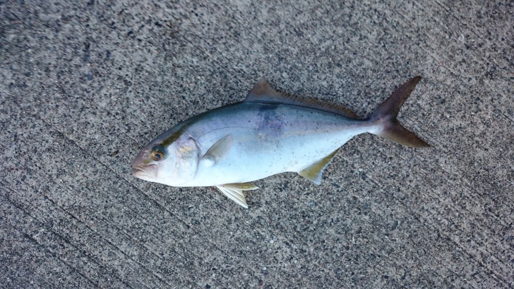 そんなこんなしていた横で小規模ナブラが発生、すかさず付けていた小さめのジグを投入すると一発でヒット、おー、大きくはないが青物じゃ!そんなに重くはないので一気に抜き上げてみると、30センチちょっとのネリゴ(カンパチの小さいやつ)、この前釣れたのがなかなか旨かったらしく、ヨメさん歓喜。