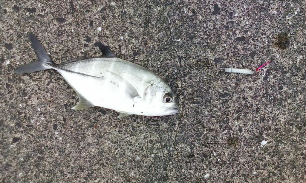 誰もいない港で一人笑いながら寄せてみると、予想通り25~6センチのギンガメ君だったが、マジか、これで釣れちゃうのか!よーし、そうと分かれば、もういくつか作って次はオボソ(スマ)を釣ってやろうぜ、と早速調子に乗る。