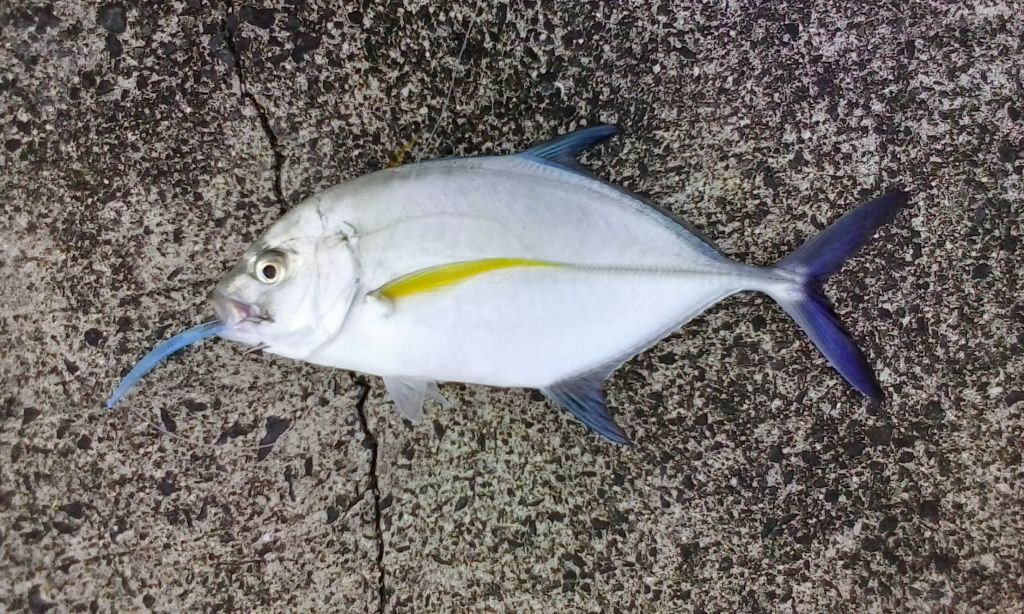 カスミアジのチビ(25センチくらい) ほいさーと抜いてみると、25センチくらいのエバ(メッキ)さん、青い背ビレ腹ビレに黄色いお手々、カスミアジのお子様である。