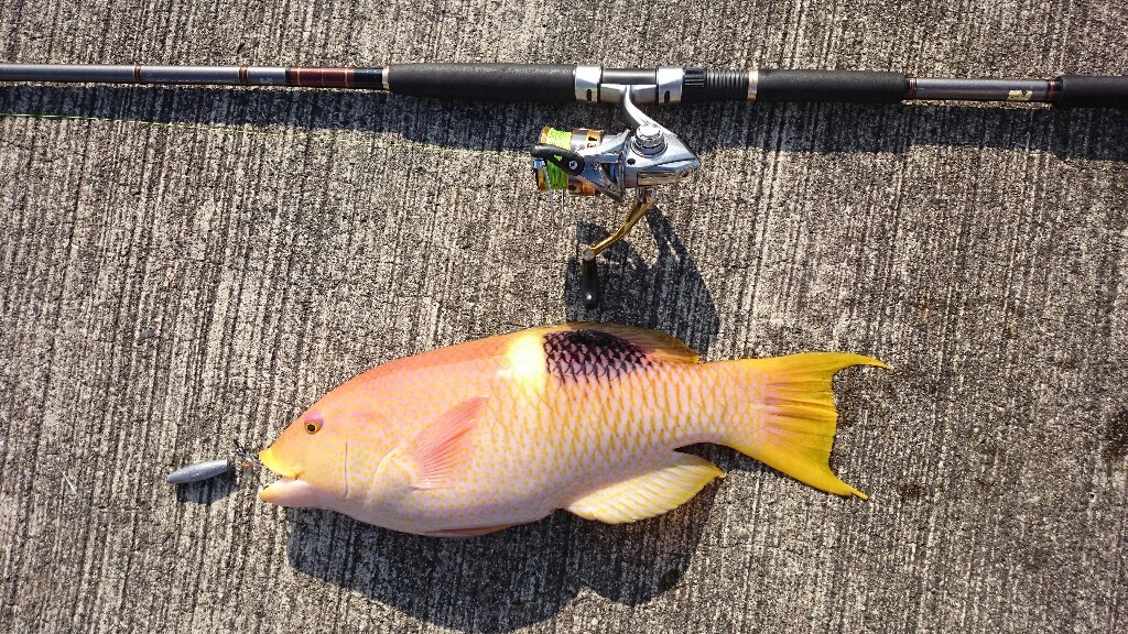 タキベラ それ以外の釣果としては、27日の昼前にそこそこサイズの何かがゲソングにヒットし、浮かせてみたら2キロ近い「タキベラ」だった、ちと悩んだがひとまずキープ。
