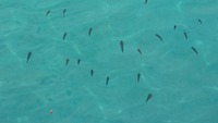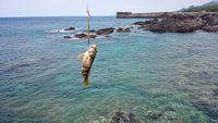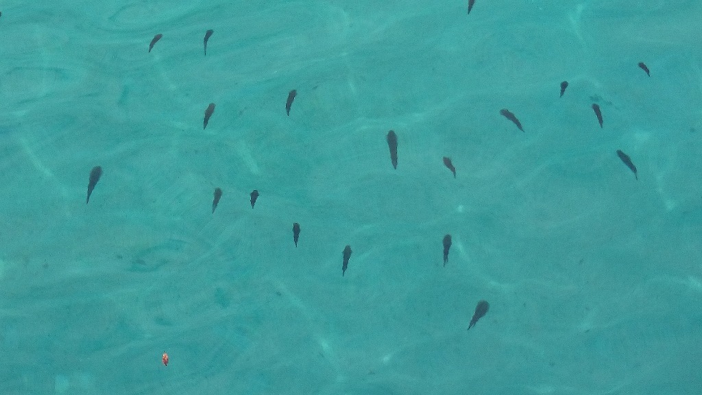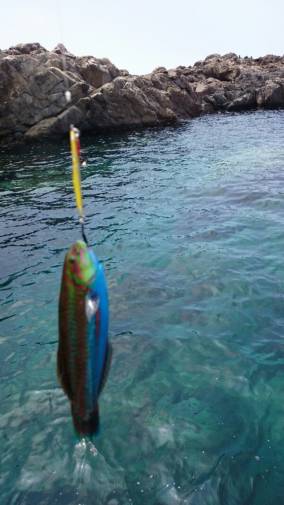 着いて海を覗き込むと、一口サイズのチビイカの群れがポヤポヤとこちらを見ている、かわええwゴツタックル(MHのロッドにPE3.5号リーダー50lBw)でイカの目玉をぶん投げ、ラインをフリーにして放置し、その横でマイブームのちっこいルアーを投げて遊ぶ。