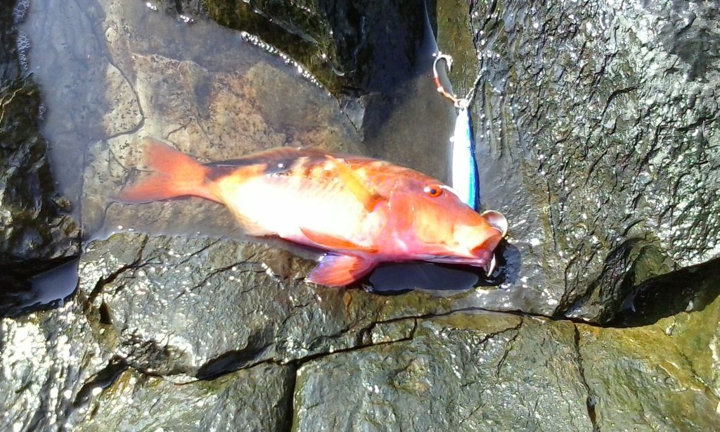 改良してきた自作ルアーを試すと、2投目で早速ヒット、どうやら30~40センチ位のメッキ君。