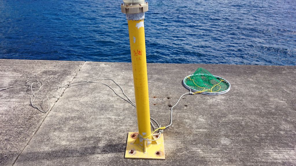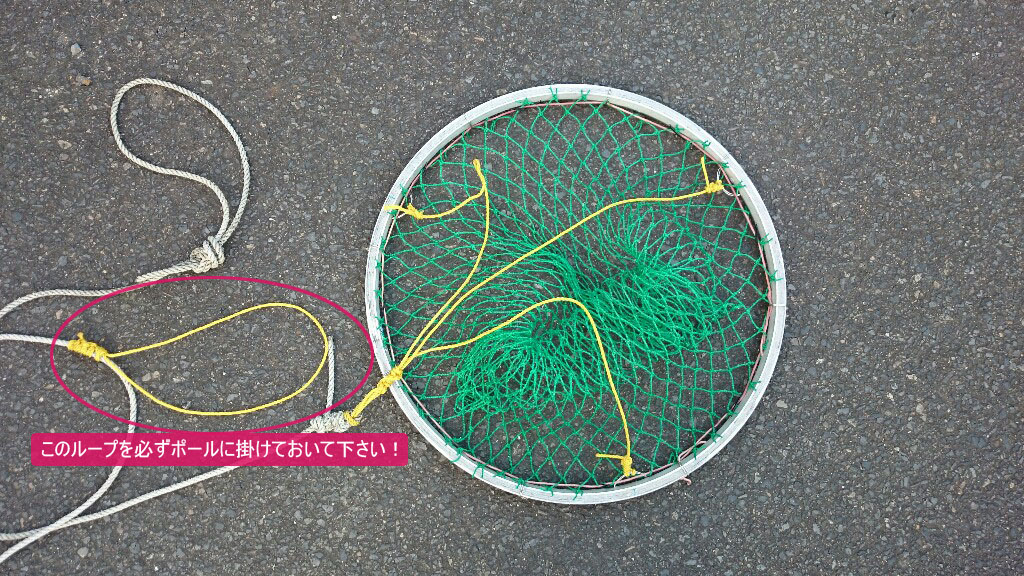 ロープの末尾のループをポールに掛けたまま海に垂らしっ放しにすると、堤防の角とロープの接触部分が痛み、やがて切れてしまいますし、場合によっては網自体が先に破損します。